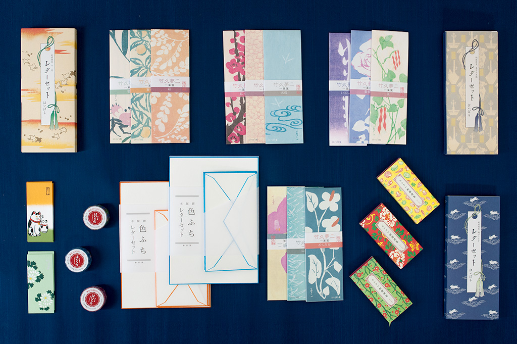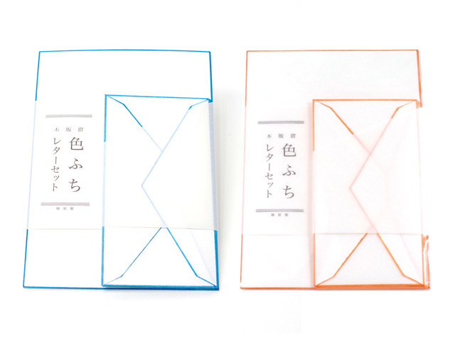 A set of six letter sheets and three envelopes made from white washi, bordered using traditional woodblock printing and brush-coloring techniques.